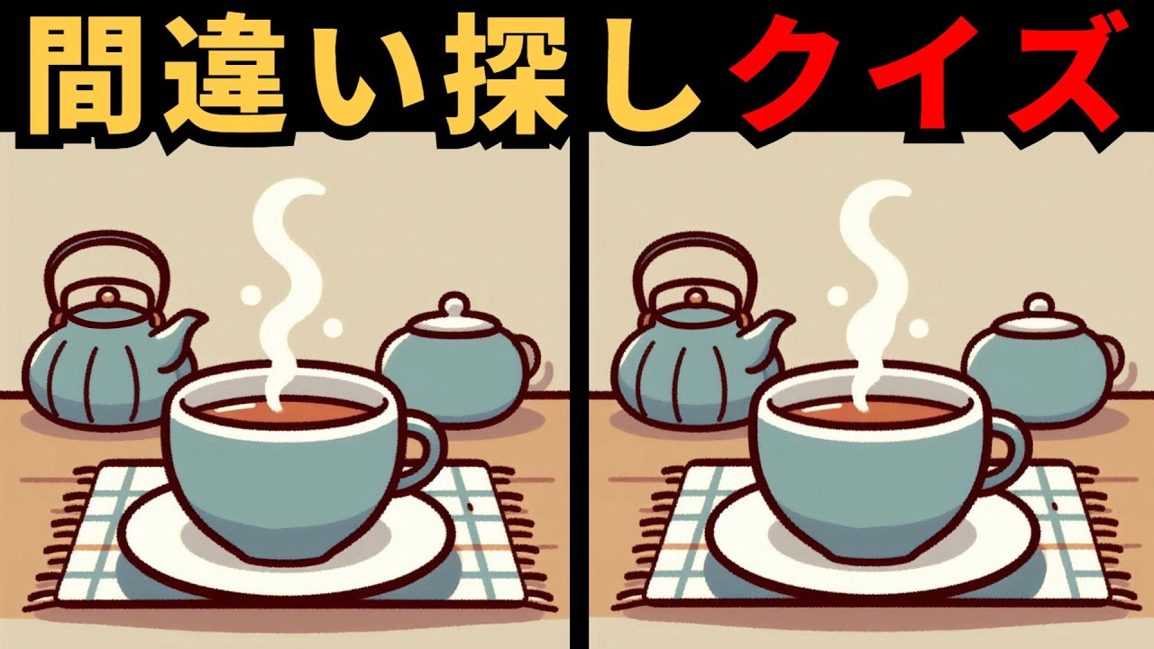 【間違い探し】 日々の脳活性化に!楽しく鍛える視覚クイズ 他チャンネルの間違い探し Twitter Facebook はてブ Pocket LINE コピー 2025.04.08 2025.04.07 絵を見て、違う3つの場所を探しましょう。 間違い探しは1問90秒です。 全部で5問の間違い探しがあります。 [クイズタイムライン] 00:16 問題 1 01:52 答え 1 02:10 問題2 03:46 答え 2 04:03 問題3 05:41 答え 3 05:57 問題4 07:35 答え 4 07:51 問題5 09:28 答え 5 #間違い探し #クイズ #パズル