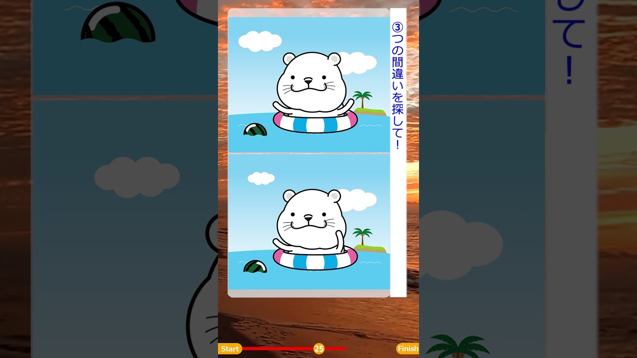 脳活チャレンジ 3つの間違い探し【白クマさん 浮き輪】#脳トレ #認知症予防 #頭の体操 #ボケ防止 他チャンネルの間違い探し Twitter Facebook はてブ Pocket LINE コピー 2025.04.18 2025.04.17 記憶力を楽しく上げる! 間違い探しを行うことで、「空間認識」や「集中力」、日々歳とともに散漫になりがちな「注意力」を鍛えることができます。 ■チャンネル登録お願いします。 正解は、関連動画をご覧ください。