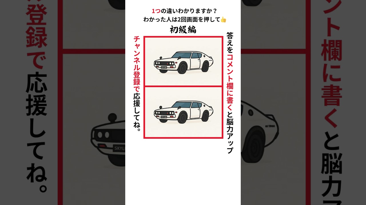 日産スカイラインの間違い探し【初級編】#脳トレ#間違い探し#アハ体験#クイズ#スカイライン 他チャンネルの間違い探し Twitter Facebook はてブ Pocket LINE コピー 2025.10.01 2025.09.30 ヒント:フロントを見ると間違いがわかりますよ!(^^)!
