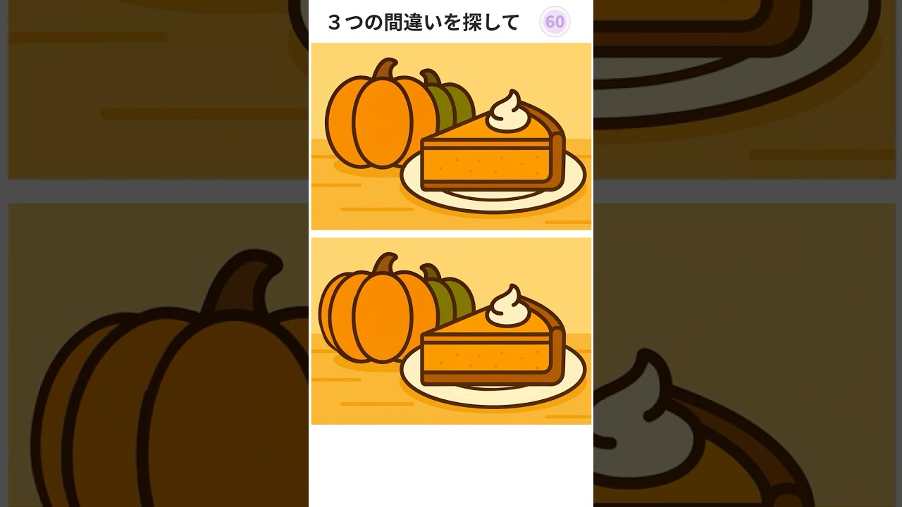 3つの間違い探し🎃パンプキンケーキ 他チャンネルの間違い探し Twitter Facebook はてブ Pocket LINE コピー 2025.10.04 2025.10.03 ほっくり甘いパンプキンケーキと、色とりどりのかぼちゃが並んだ秋らしいイラストです。 この2枚の絵の中には 3つの間違い が隠されています。 じっくり見比べて、すべて見つけられるかな?
