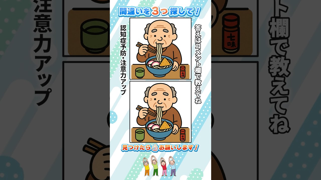 間違い探しで認知症予防!集中力と注意力アップ!#間違い探し #脳トレ #findthedifference 他チャンネルの間違い探し Twitter Facebook はてブ Pocket LINE コピー 2025.10.15 2025.10.14 答えはコメントで教えてね! ▶️ 楽しんでもらえましたら、イイネ👍チャンネル登録よろしくお願いします! VOICEVOX:ずんだもん