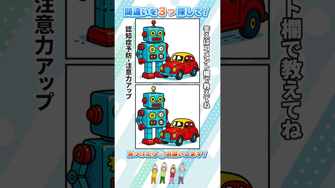間違い探しで認知症予防!集中力と注意力アップ!#間違い探し #脳トレ #findthedifference 他チャンネルの間違い探し Twitter Facebook はてブ Pocket LINE コピー 2025.10.19 2025.10.18 答えはコメントで教えてね! ▶️ 楽しんでもらえましたら、イイネ👍チャンネル登録よろしくお願いします! VOICEVOX:ずんだもん