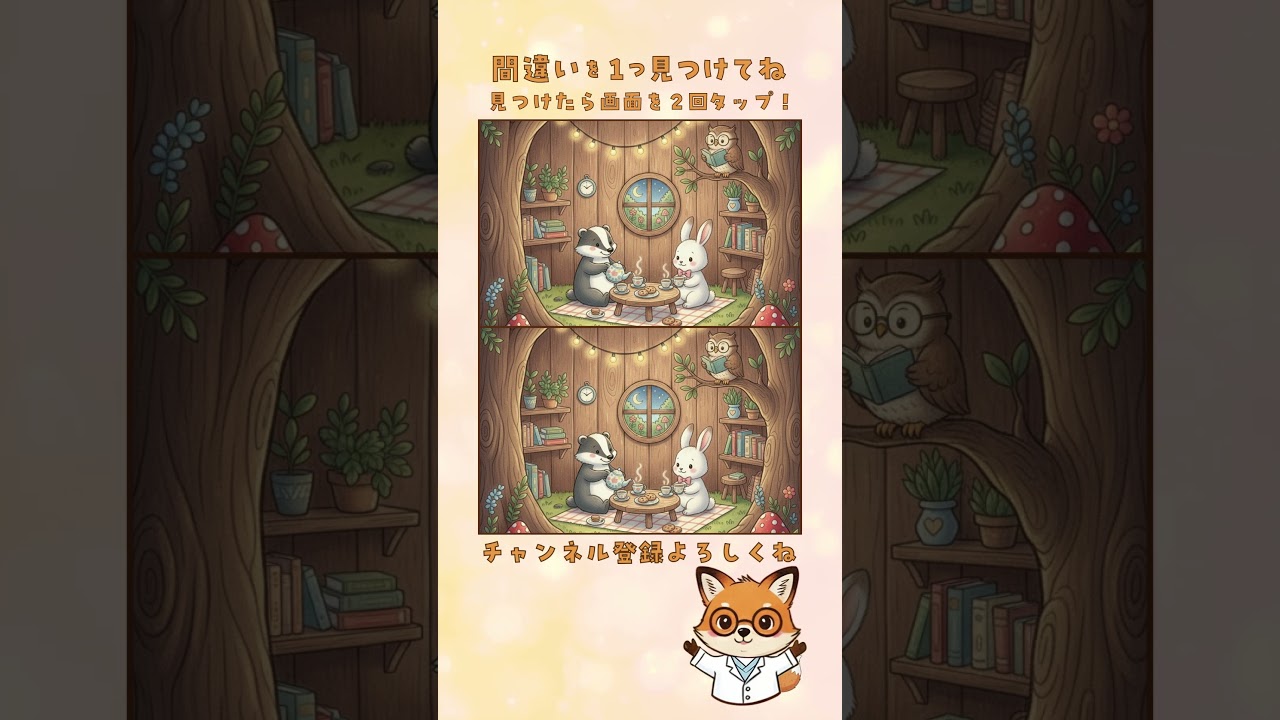 間違い探し🦊木の家でのアフタヌーンティー#動物 #イラスト 他チャンネルの間違い探し Twitter Facebook はてブ Pocket LINE コピー 2025.10.20 2025.10.19 君は何秒で見つけられる? ウサギの探検家 間違いは一つ!探してみてね! 🦊チャンネル登録よろしくね🦊