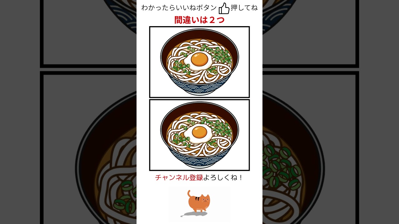【まちがいさがし80 月見うどん】#shorts #脳トレ #間違い探し 他チャンネルの間違い探し Twitter Facebook はてブ Pocket LINE コピー 2025.10.26 2025.10.25 よ〜く見ると…あれ?何かちがう? 上下のイラストを見比べて、間違いを見つけてみよう! 📺 チャンネル登録&いいねもお忘れなく! #間違い探し #脳トレ #高齢者 #60代 #70代 #認知症予防