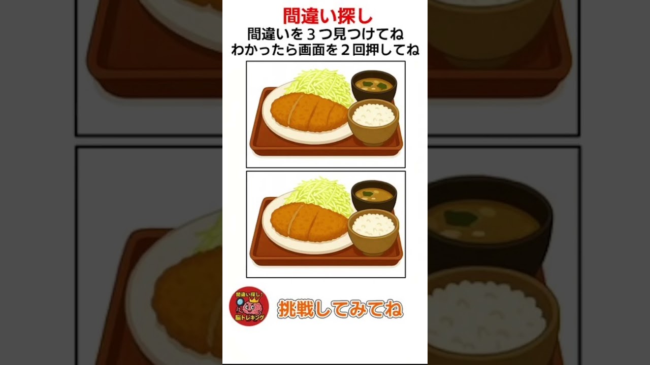 カツ定食の間違い探し脳トレクイズ #間違い探し #脳トレ #クイズ #shorts #認知症予防 他チャンネルの間違い探し Twitter Facebook はてブ Pocket LINE コピー 2025.10.28 2025.10.27