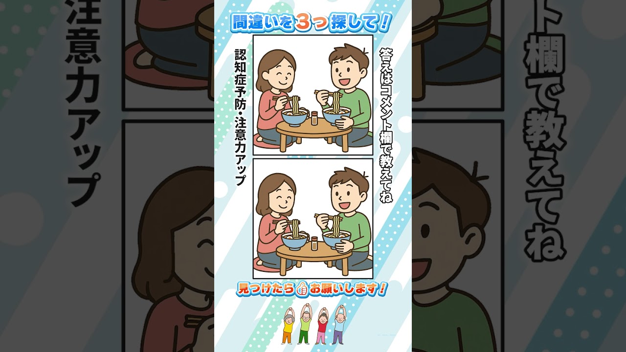 間違い探しで認知症予防!集中力と注意力アップ!#間違い探し #脳トレ #findthedifference 他チャンネルの間違い探し Twitter Facebook はてブ Pocket LINE コピー 2025.10.30 2025.10.29 答えはコメントで教えてね! ▶️ 楽しんでもらえましたら、イイネ👍チャンネル登録よろしくお願いします! VOICEVOX:ずんだもん