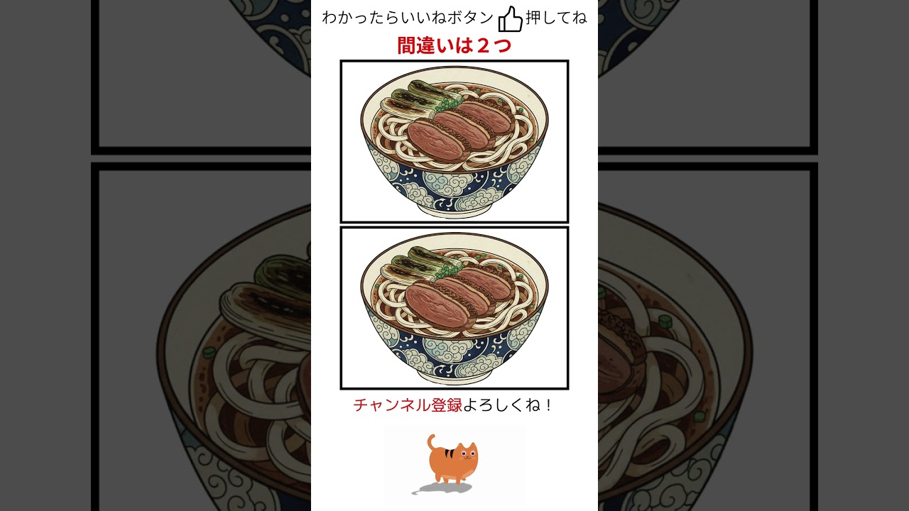 【まちがいさがし85 鴨南蛮うどん】#shorts #脳トレ #間違い探し 他チャンネルの間違い探し Twitter Facebook はてブ Pocket LINE コピー 2025.10.31 2025.10.30 よ〜く見ると…あれ?何かちがう? 上下のイラストを見比べて、間違いを見つけてみよう! 📺 チャンネル登録&いいねもお忘れなく! #間違い探し #脳トレ #高齢者 #60代 #70代 #認知症予防