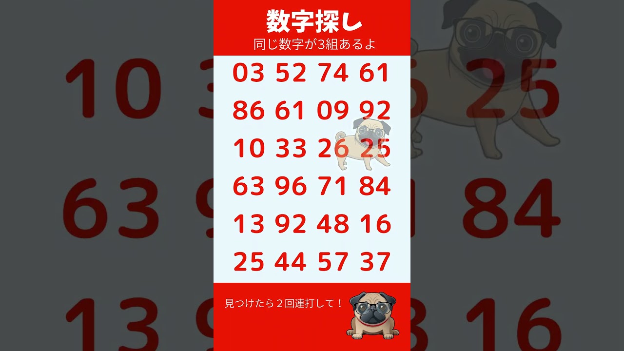 【脳トレ】 違う数字を探して! #findthedifference #間違い探し 他チャンネルの間違い探し Twitter Facebook はてブ Pocket LINE コピー 2025.11.03 同じ数字・文字を3組見つけてみましょう! Try to find 3 matching sets of numbers or letters! 같은 숫자나 문자를 3쌍 찾아보세요!