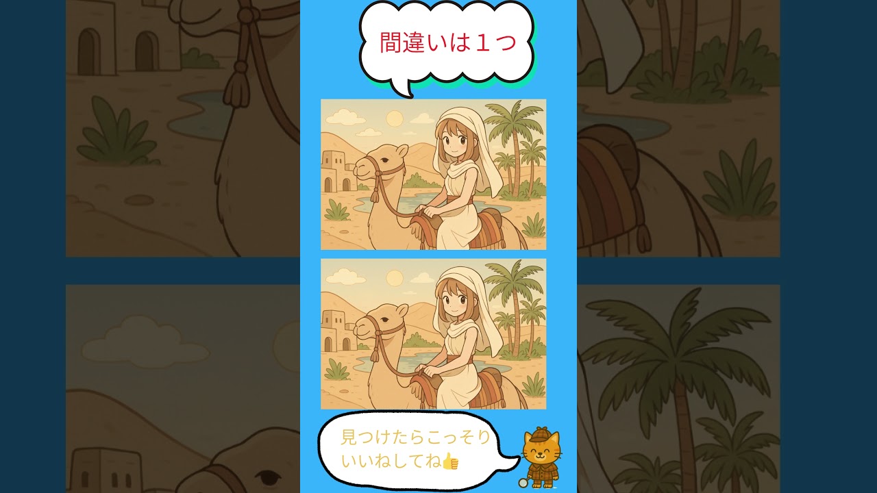砂漠の間違い探し|1つ見つけられる?[毎日投稿][脳トレ] 他チャンネルの間違い探し Twitter Facebook はてブ Pocket LINE コピー 2025.11.03 2025.11.02 毎日脳トレ!トラッキー!です。 AIが作る間違い探し・脳トレ動画!大人も子どもも楽しめる無料クイズを毎日投稿しています。 #shorts