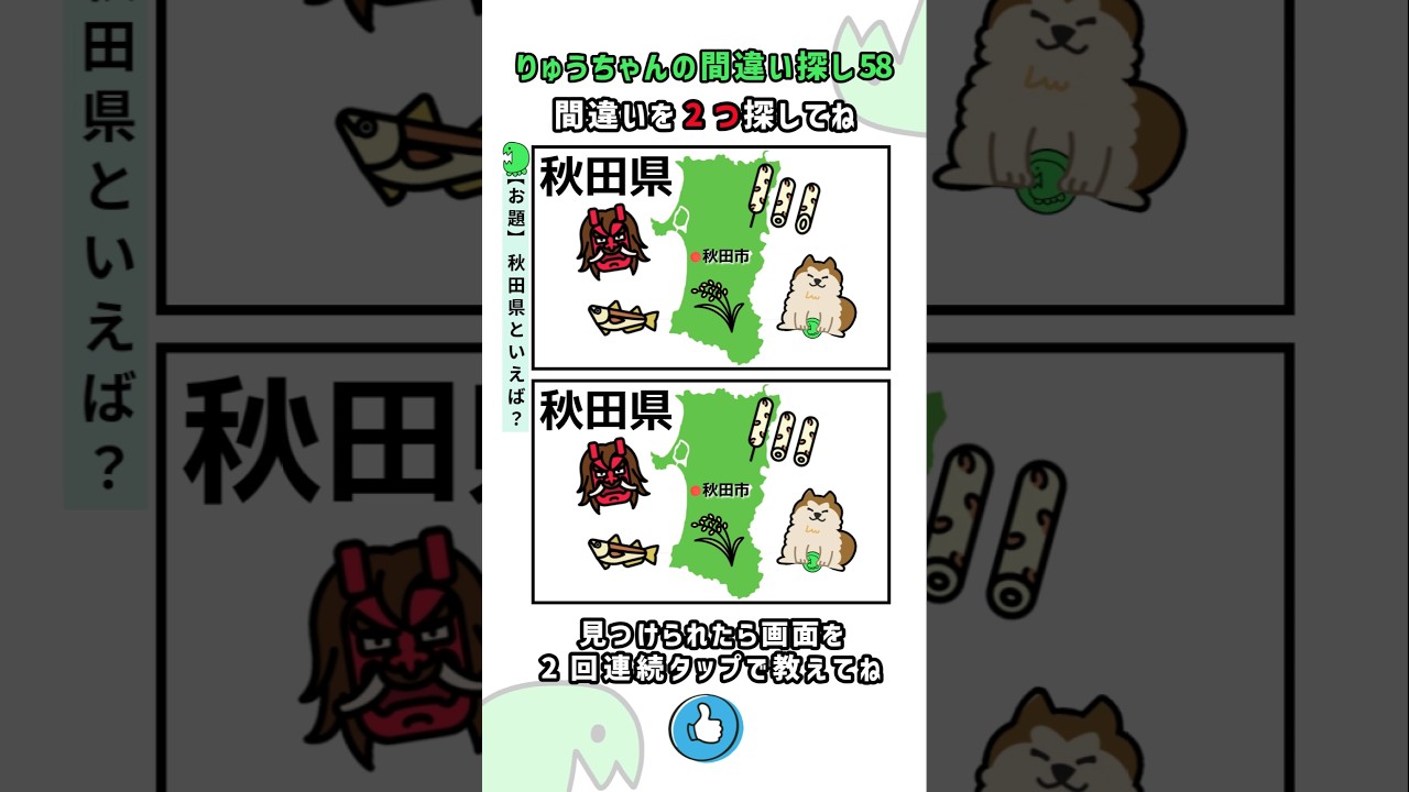 りゅうちゃんの間違い探し58【初級】 #間違い探し #脳トレ #秋田県 他チャンネルの間違い探し Twitter Facebook はてブ Pocket LINE コピー 2025.11.04 2025.11.03 りゅうちゃんの間違い探し58です。 オリジナルキャラクターの「りゅうちゃん」が毎回どこかに登場します。 今回は、秋田犬が持っているおもちゃのボールのイラストになっています♪ 都道府県シリーズ第4弾の秋田県の間違い探しです。 あきたこまち大好きです。お米最高!