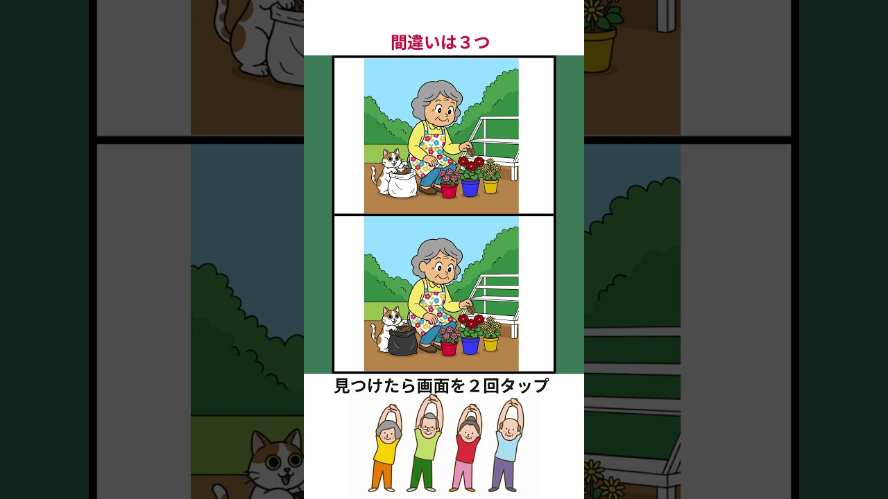 花屋さんの一日をテーマにした10枚のイラストから間違いを探す脳トレ動画。