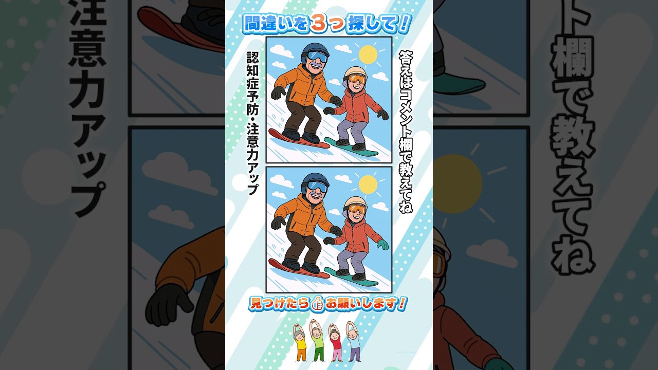 間違い探しで認知症予防!集中力と注意力アップ!#間違い探し #脳トレ #findthedifference 他チャンネルの間違い探し Twitter Facebook はてブ Pocket LINE コピー 2025.11.14 2025.11.13 答えはコメントで教えてね! ▶️ 楽しんでもらえましたら、イイネ👍チャンネル登録よろしくお願いします! VOICEVOX:ずんだもん