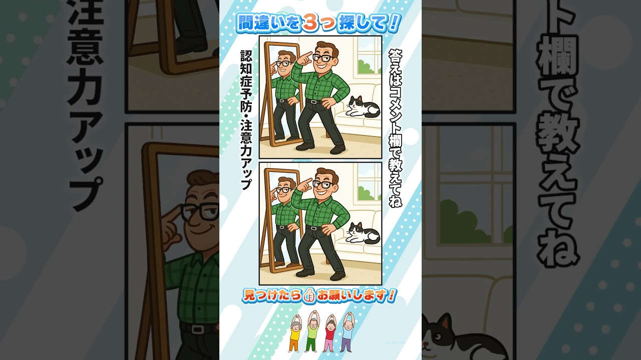間違い探しで認知症予防!集中力と注意力アップ!#間違い探し #脳トレ #findthedifference 他チャンネルの間違い探し Twitter Facebook はてブ Pocket LINE コピー 2025.11.15 2025.11.14 答えはコメントで教えてね! ▶️ 楽しんでもらえましたら、イイネ👍チャンネル登録よろしくお願いします! VOICEVOX:ずんだもん