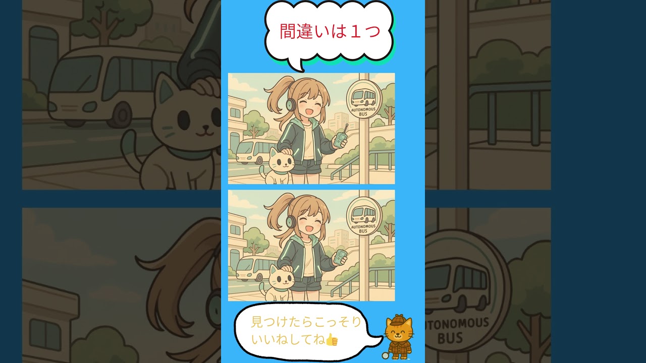 バス停の間違い探し|1つ見つけられる?[毎日投稿][脳トレ] 他チャンネルの間違い探し Twitter Facebook はてブ Pocket LINE コピー 2025.11.17 2025.11.16 毎日脳トレ!トラッキー!です。 AIが作る間違い探し・脳トレ動画!大人も子どもも楽しめる無料クイズを毎日投稿しています。 #shorts