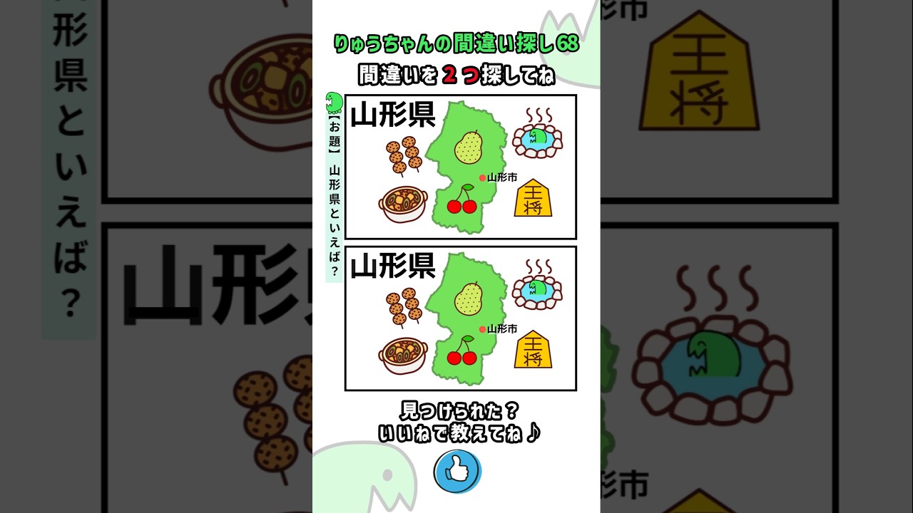 りゅうちゃんの間違い探し68【初級】 #間違い探し #脳トレ #山形県 他チャンネルの間違い探し Twitter Facebook はてブ Pocket LINE コピー 2025.11.23 2025.11.22 りゅうちゃんの間違い探し68です。 オリジナルキャラクターの「りゅうちゃん」が毎回どこかに登場します。 今回は、銀山温泉に浸かっています。 都道府県シリーズ第6弾の「山形県」の間違い探しです。 山形の郷土料理「芋煮」がとても美味しそうで食べてみたいです。