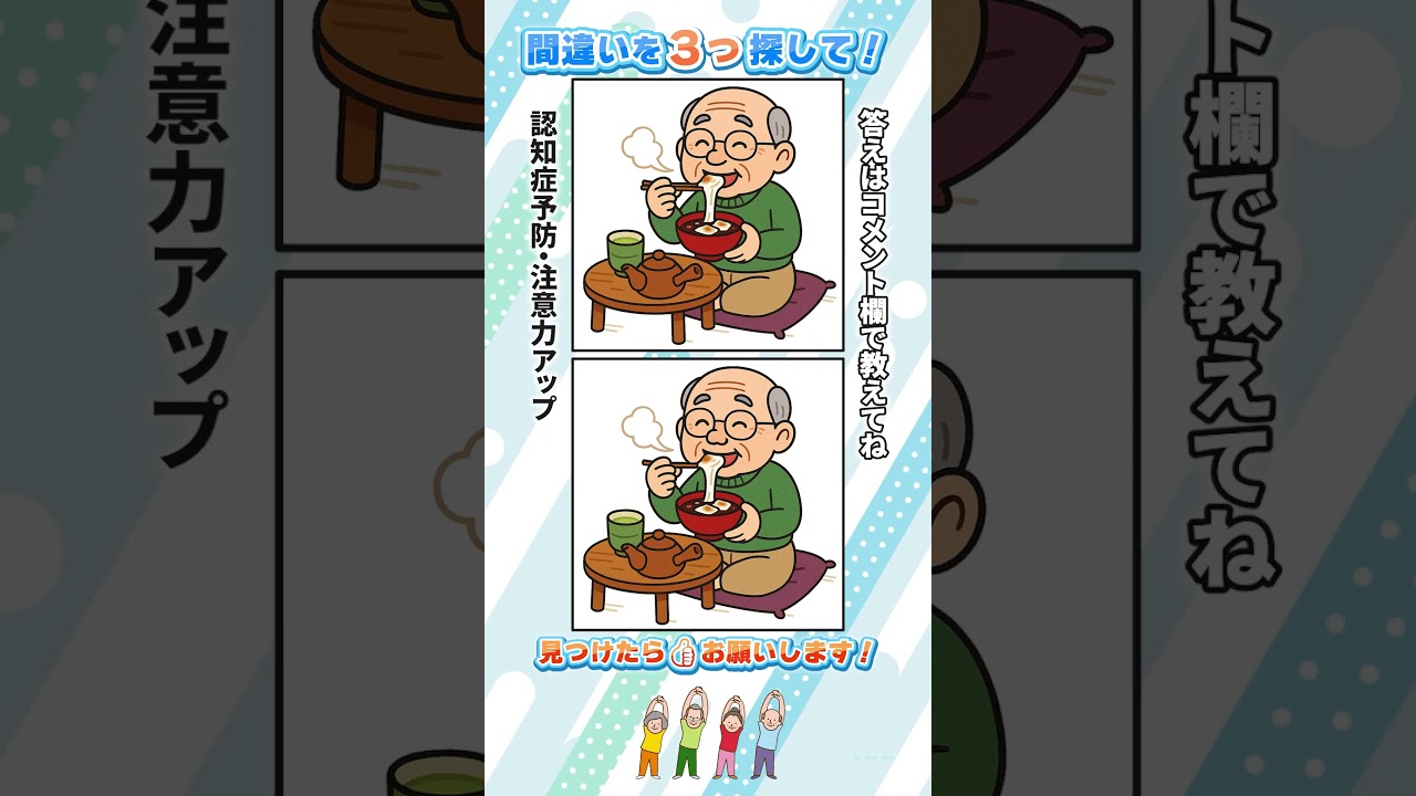 【間違い探しクイズ】Cozy Spot the Difference 老化予防に!高齢者向け脳トレ【集中力アップ!】 他チャンネルの間違い探し Twitter Facebook はてブ Pocket LINE コピー 2025.11.27 2025.11.26 答えはコメントで教えてね! ▶️ 楽しんでもらえましたら、イイネ👍チャンネル登録よろしくお願いします! VOICEVOX:ずんだもん