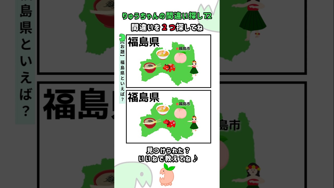 りゅうちゃんの間違い探し72【初級】 #間違い探し #脳トレ #福島県 他チャンネルの間違い探し Twitter Facebook はてブ Pocket LINE コピー 2025.11.28 2025.11.27 りゅうちゃんの間違い探し72です。 都道府県シリーズ第7弾の「福島県」の間違い探しです。 桃は果物の中でもトップ3に入るくらい好きです。福島の桃、食べたい。。。