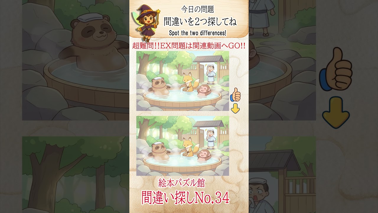間違い探しNo.34 絵本パズル館 2つの違いを見つけられる?👀🧩Spot the Difference👀🧩#間違い探し #クイズ #脳トレ #findthedifference #puzzle 他チャンネルの間違い探し Twitter Facebook はてブ Pocket LINE コピー 2025.12.02 2025.12.01 絵本パズル館へようこそ🍀今日の問題は動物専用の露天風呂!? この動画の間違いは全部で2つ!あなたは全部見つけられる? 見つけた人はコメントで教えてね👇 Find the difference puzzle! Can you spot the 2 differences?