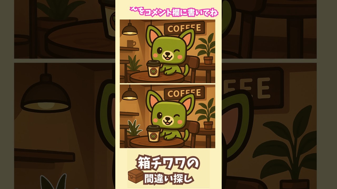 【3つの違い】おしゃれカフェで間違い探し☕|初心者でも挑戦できる脳トレ あなたの“観察力”にチャレンジ! 他チャンネルの間違い探し Twitter Facebook はてブ Pocket LINE コピー 2025.12.05 2025.12.04 #間違い探し #まちがいさがし #脳トレ #箱チワワ #犬好きさんと繋がりたい #間違い探しチャレンジ #spotTheDifference #shorts おしゃれなカフェをテーマにした“上下間違い探し”です☕✨ 違いは全部で 3つ!あなたは何秒で見つけられるかな? かわいい脳トレで、今日もほんの少し元気になれますように🐶📦🌈 VOICEVOX:四国めたん