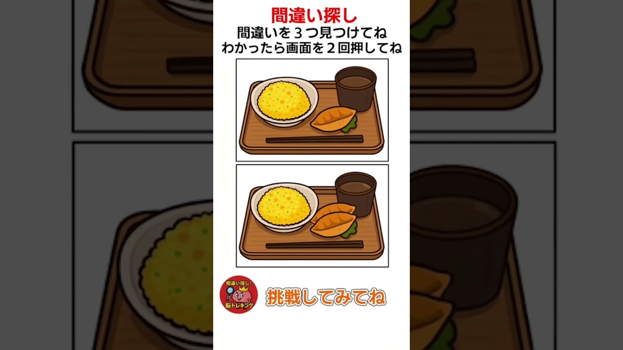 チャーハンと餃子のお寿司の間違い探し脳トレクイズ #shorts #間違い探し #脳トレ #認知症予防 他チャンネルの間違い探し Twitter Facebook はてブ Pocket LINE コピー 2025.12.05 2025.12.04