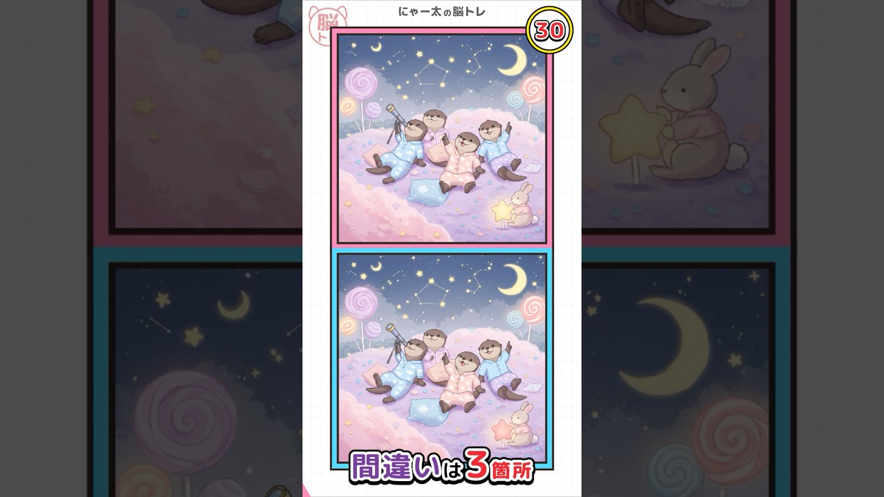 【脳トレ】間違い探し・簡単脳活タイム!【にゃー太の脳トレ】No.79 #にゃー太 #間違い探し #脳トレ #にゃーた 他チャンネルの間違い探し Twitter Facebook はてブ Pocket LINE コピー 2025.12.06 2025.12.05 @Nyata-Brain-Training 「にゃー太の脳トレ」チャンネルでは、間違い探し・アハムービー・記憶クイズなど、脳トレに関するクイズやゲームをお届け中! 今回はショート動画でサクッと挑戦できる間違い探しです。 集中力アップ、脳のトレーニングにぴったり♪